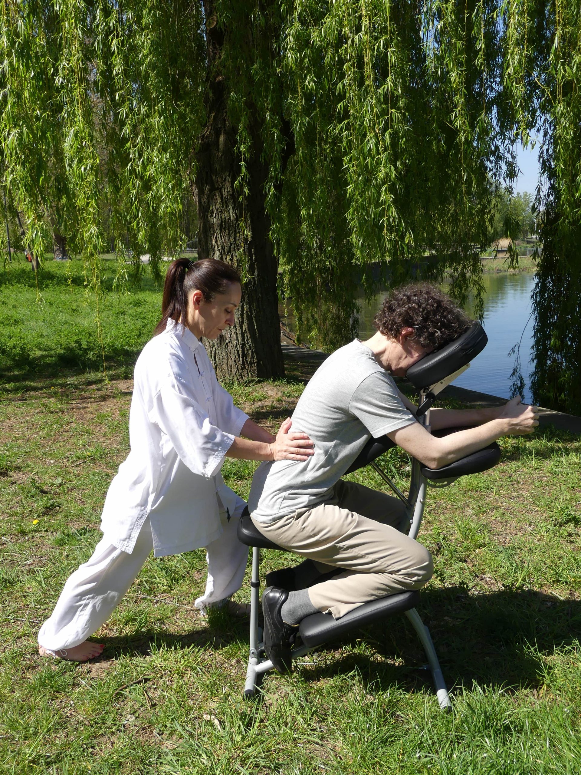 Puis, la personne est allongée habillée d’une tenue souple, sur futon ou assise sur chaise.